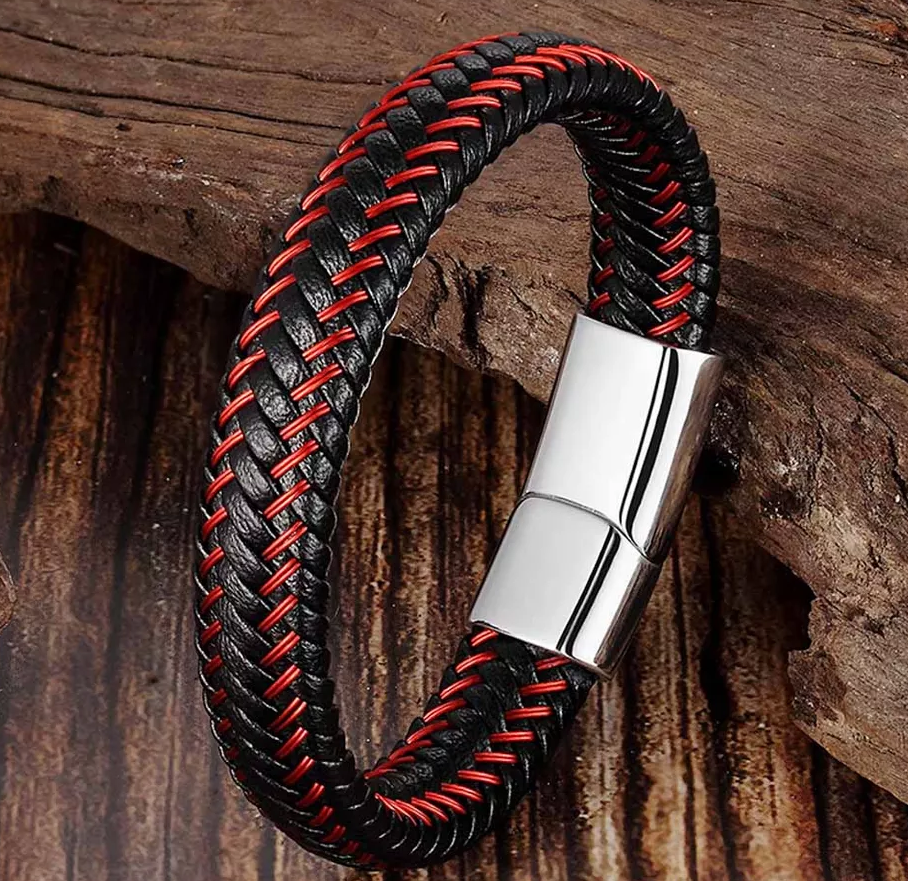 Ανδρικό βραχιόλι από δέρμα και ατσάλι μήκους 21cm σε αποχρώσεις μαύρο και κόκκινο.